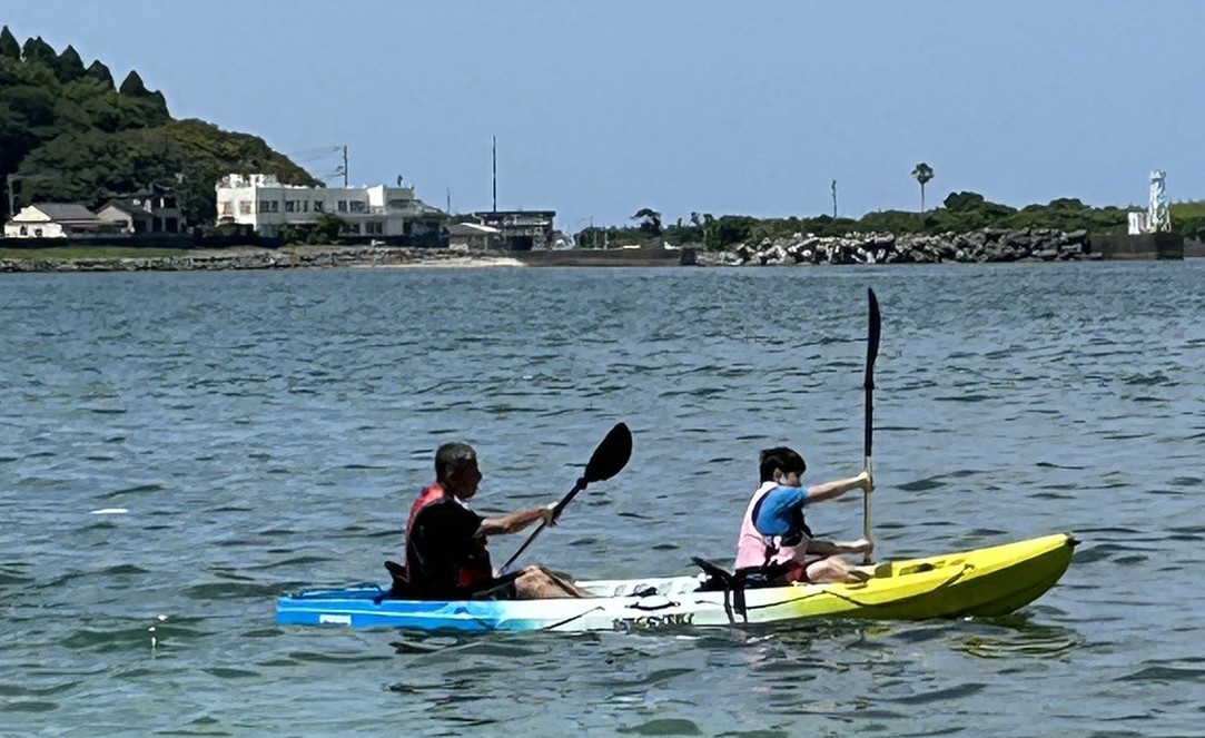 BlueSea-UchiumiBase近くの小内海海岸にてカヤック体験。きれいな海をカヤックで散歩はいかかですか?海が透き通っている日などは魚が泳いでいるのが見えますよ。